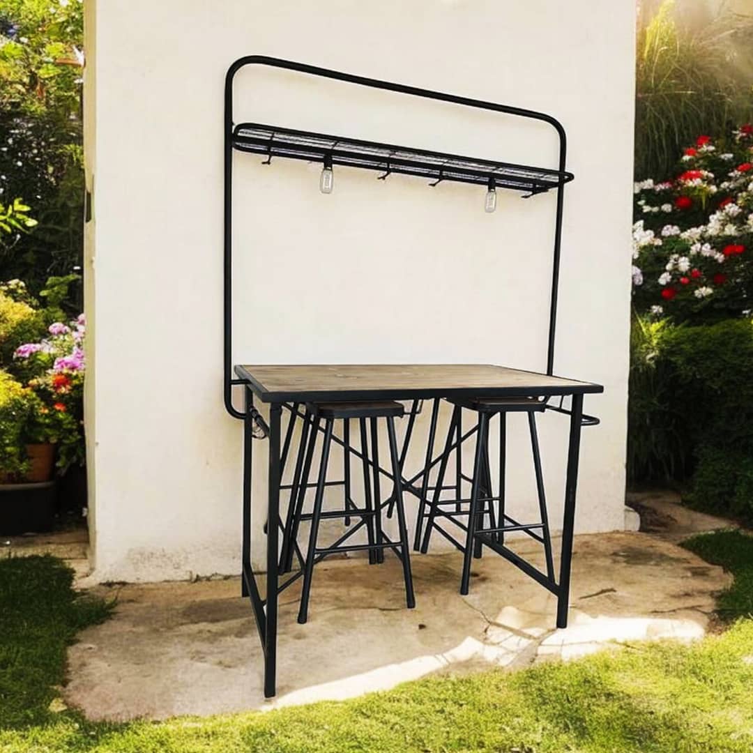 Bar table set with four stools and a frame with lighting and the option to hang your wine glasses, is a sturdy, industrial-looking, rectangular table with a wood-look MDF top. Due to its handy option to slide the stools under the top, it is a compact bar table that will fit into any interior or garden. Robust, stable, sturdy, industrial, vintage, design, just a few words that fit this beautiful piece of furniture.