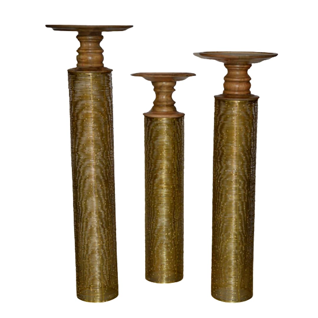 WIRED CYLINDRICAL IRON & WOODEN CANDLE HOLDER GOLD COLOR